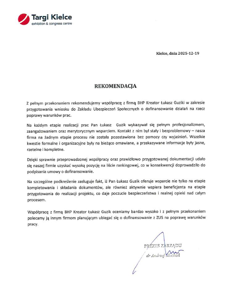 Opublikowano na Bogdan KudlaTrustindex sprawdza, czy pierwotnym źródłem recenzji jest Google. Bardzo dobra i rzetelna wspolpracaOpublikowano na DREW-HAT I domy I więźby CNC I drewno KVH, BSHTrustindex sprawdza, czy pierwotnym źródłem recenzji jest Google. Współpracujemy z firmą BHP prowadzoną przez pana Łukasza Guzika i z pełnym przekonaniem możemy polecić jego usługi. Pan Łukasz wykazuje się wysoką fachowością, rzetelnością oraz dużym zaangażowaniem. Wszystkie szkolenia i dokumentacja są przygotowywane terminowo i na najwyższym poziomie. Zdecydowanie polecamy jego usługi wszystkim przedsiębiorcom, którzy cenią bezpieczeństwo, profesjonalizm i spokój w codziennym funkcjonowaniu firmy.Opublikowano na Bogdan PiskadłoTrustindex sprawdza, czy pierwotnym źródłem recenzji jest Google. Polecam , profesjonalne podejście do klienta i zadań . Pomoc w zakresie obsługi dotacji ZUS . Przygotowanie dokumentów i protokołów doskonałe. Bardzo dobry kontakt telefoniczny i osobisty.Opublikowano na Bogdan KudlaTrustindex sprawdza, czy pierwotnym źródłem recenzji jest Google. polecam bardzo rzetelna i przyjazna firma korzysta z usług i jestem mega zadowolonyOpublikowano na Adam MichalikTrustindex sprawdza, czy pierwotnym źródłem recenzji jest Google. Polecam usługi Pana Łukasza, pełen profesjonalizm.Opublikowano na Jacek RTrustindex sprawdza, czy pierwotnym źródłem recenzji jest Google. BHP Kreator to profesjonalna i rzetelna firma pomagająca uzyskać dofinansowanie z ZUS na poprawę warunków pracy. Dzięki kompetencjom, wiedzy i zaangażowaniu Pana Łukasza na każdym etapie (złożenia wniosku, realizacji projektu oraz jego rozliczenia) byliśmy zaopiekowani. Serdecznie polecam usługi tej firmy.Opublikowano na Magdalena KopackaTrustindex sprawdza, czy pierwotnym źródłem recenzji jest Google. Bardzo polecam współpracę z panem Łukaszem - to profesjonalista, który zna się na rzeczy. Pomógł nam pozyskać dotację z ZUS na poprawę BHP we firmie (udało się otrzymać pieniądze dla dwóch firm już w pierwszym naborze - to o czymś świadczy), potem również przygotował dokumentację niezbędną do odbioru projektu. W BHP Kreator współpraca jest kompleksowa od początku do końca. Nie ma problemu z kontaktem, pan Łukasz, gdy nie może odebrać to zawsze oddzwania a na maile odpisuje nawet "w nocy o północy" ;)Opublikowano na K BTrustindex sprawdza, czy pierwotnym źródłem recenzji jest Google. Profesjonalne doradztwo firmy. Zaangażowanie i terminowość powoduje że bardzo dobrze współpracuje się z panem Łukaszem. Bardzo dobry kontakt